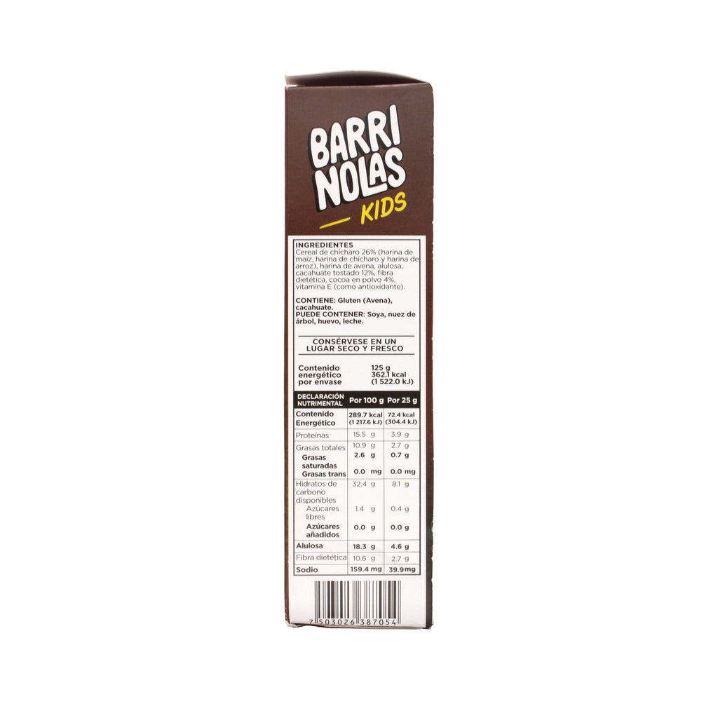 Cereal de chícharo harina de maíz, harina de avena, harina de chícharo y harina de arroz, alulosa, cacahuate tostado, fibra dietética, cocoa en polvo, vitamina E