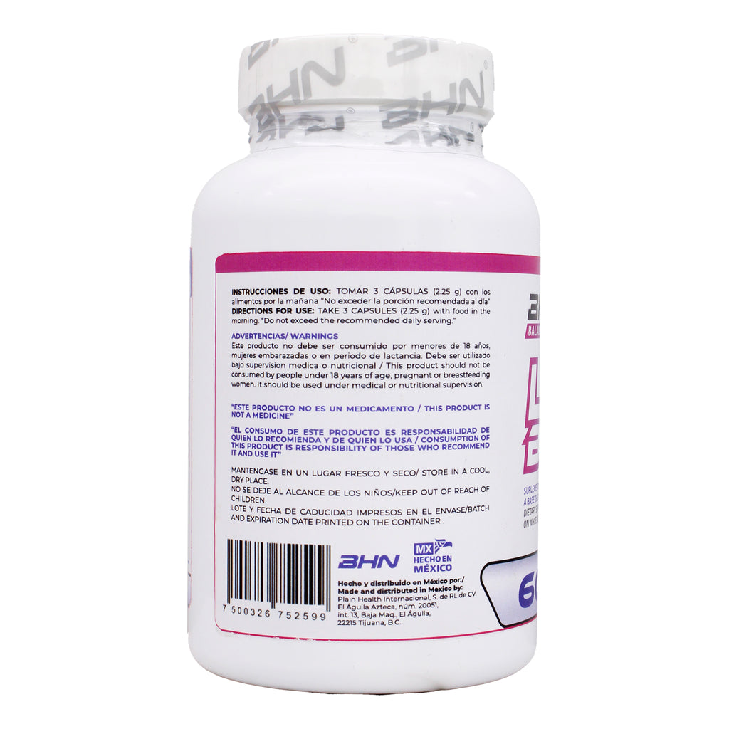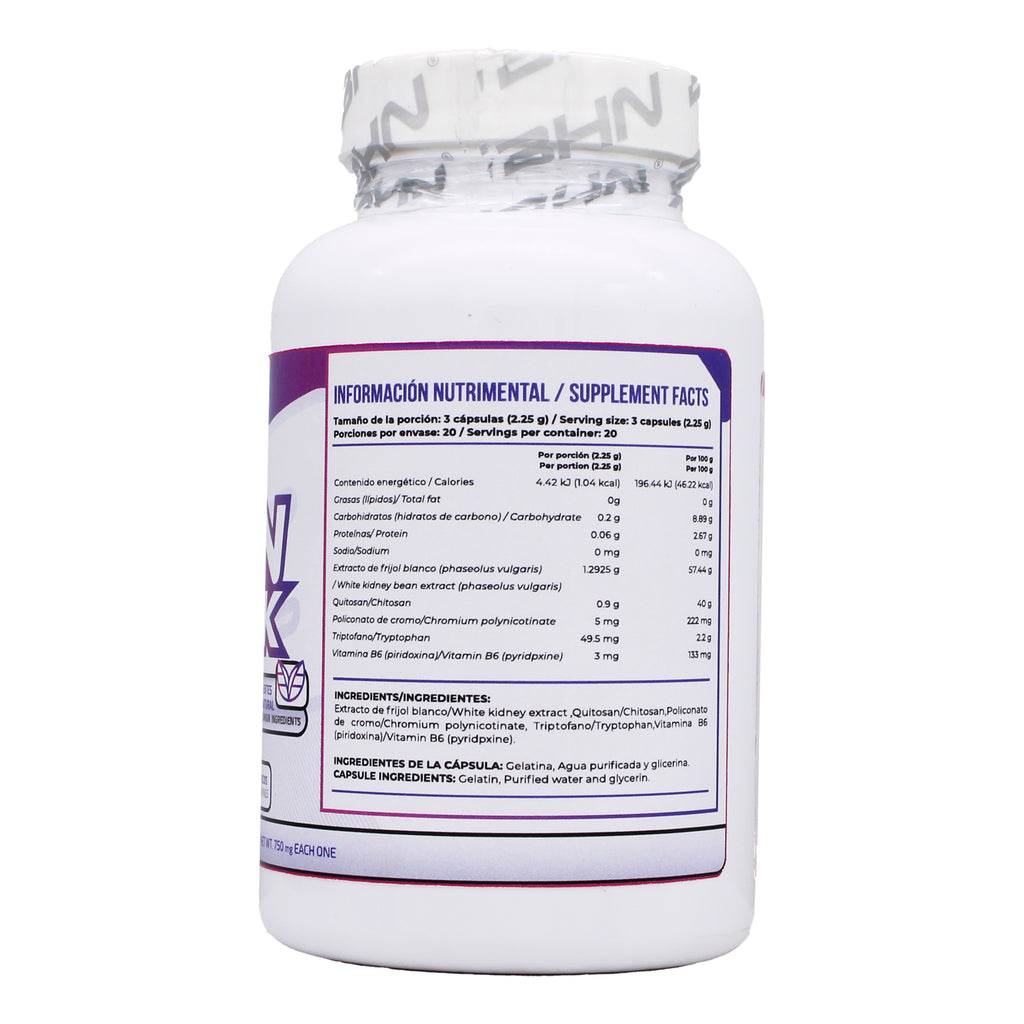 Extracto de frijol blanco, quitosan, polinicotinato de cromo, triptofano, vitamina B6, contiene derivados de leche, soja, huevos, maní o mariscos