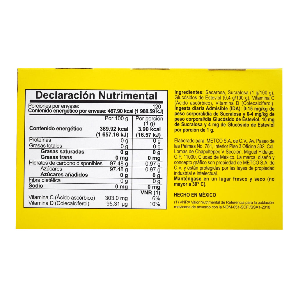 Sacarosa, sucralosa, glucósidos de esteviol, vitamina C, D