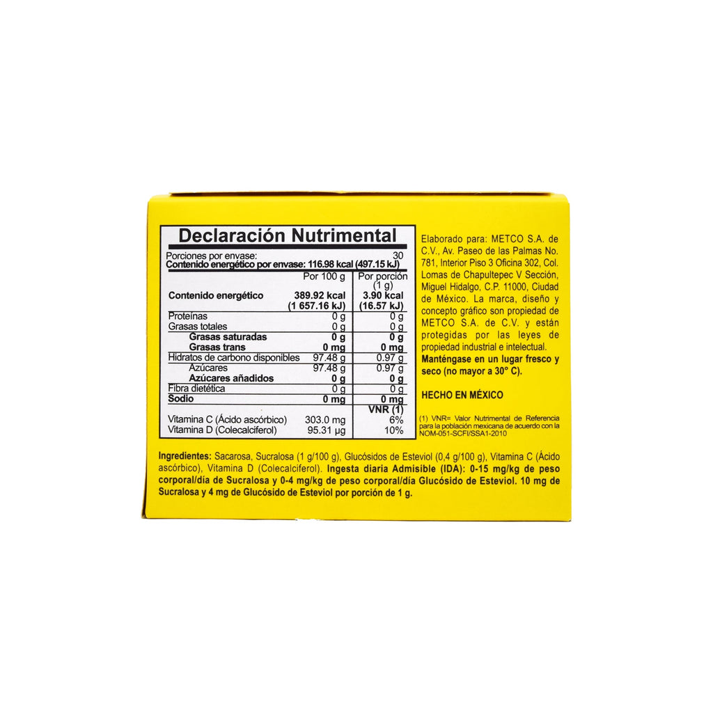 Sacarosa, sucralosa, glucósidos de esteviol, vitamina C, D