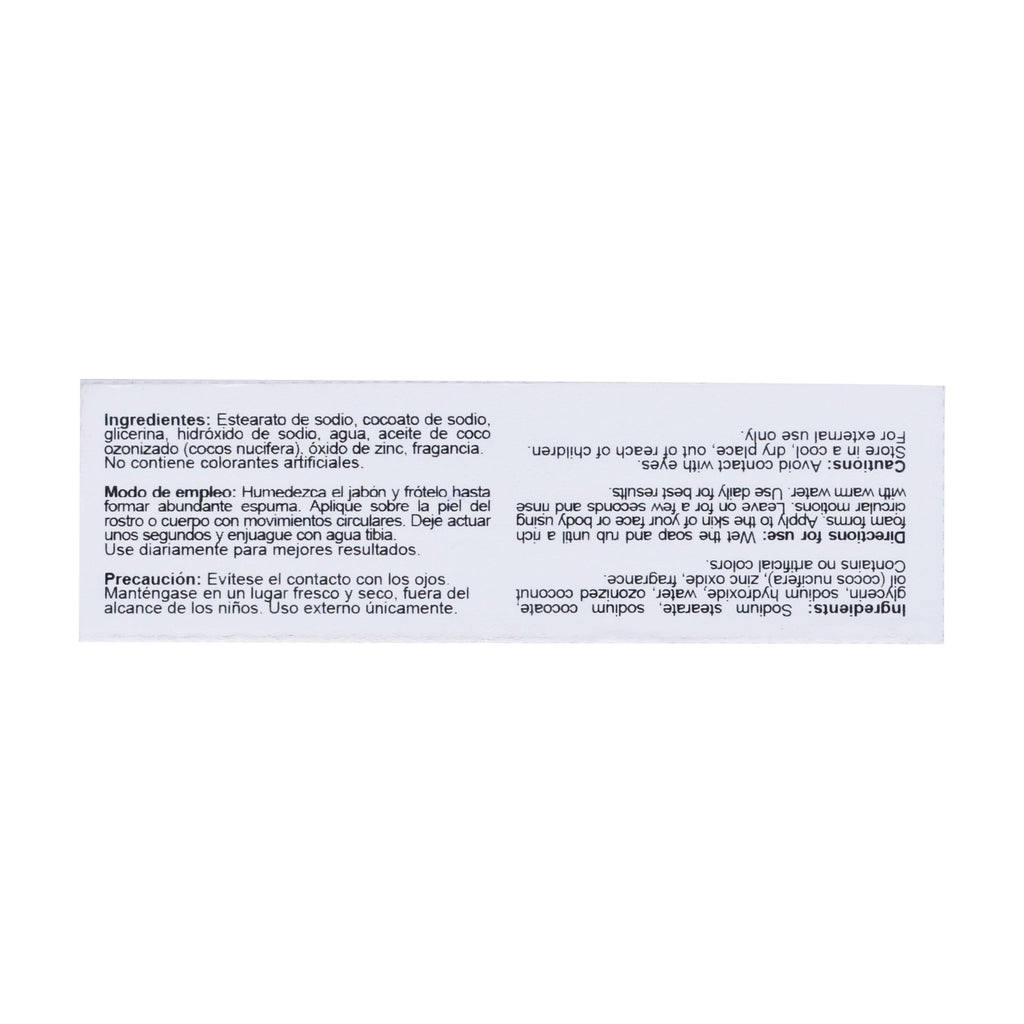 Estearato de sodio, glicerina, hidróxido de sodio, agua, aceite de coco ozonizado, óxido de zinc, fragancia