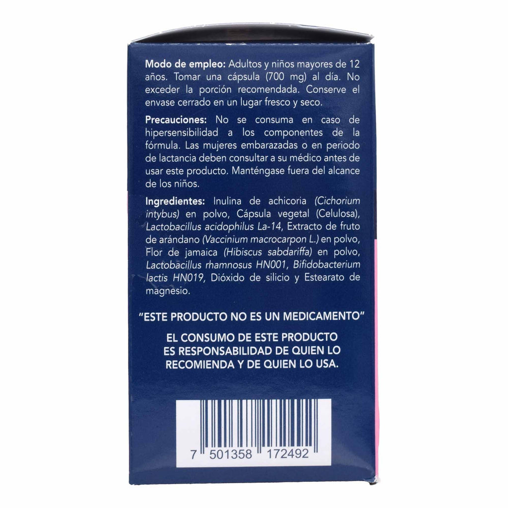 Está elaborado con inulina de achicoria, arándano, lactobacillus acidophilus, lactobacillus rhamnosus, bifidobacterium lactis
