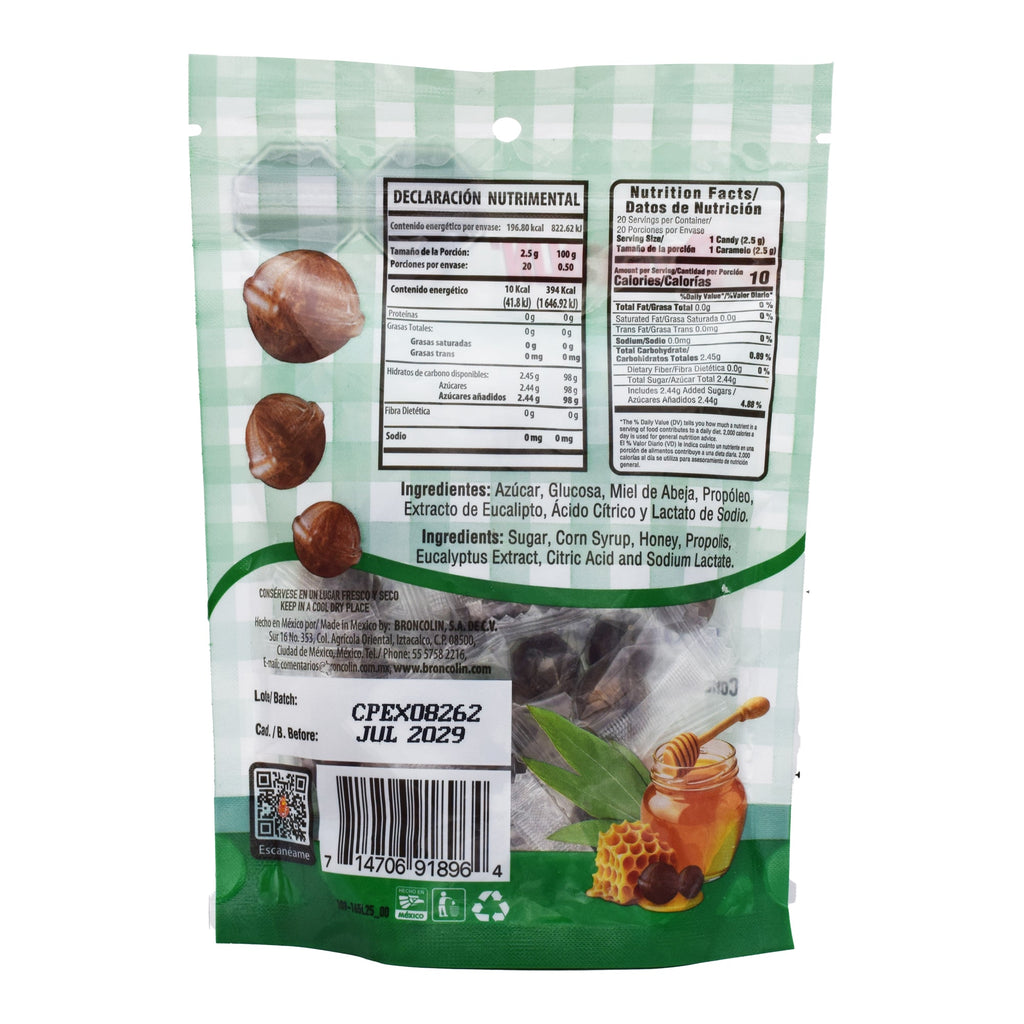 Azúcar, Glucosa, Miel de Abeja, Propóleo, Extractos de Eucalipto, Ácido Cítrico y Lactato de Sodio