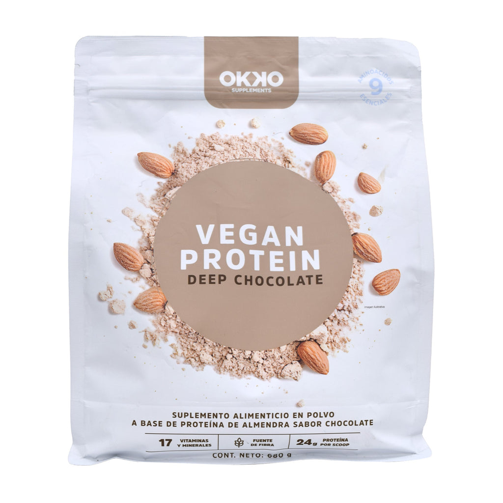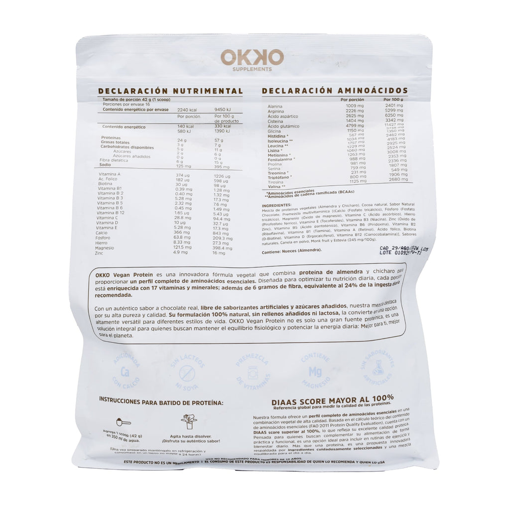 Mezcla de proteínas vegetales de almendra y chícharo, cocoa natural, sabor natural chocolate, premezcla multivitamínica, calcio, fósforo, magnesio, vitamina C, E, B3, B5, B6, B2, B1, B12, A, D, hierro, zinc, ácido fólico, biotina, canela en polvo, monk fruit y estevia