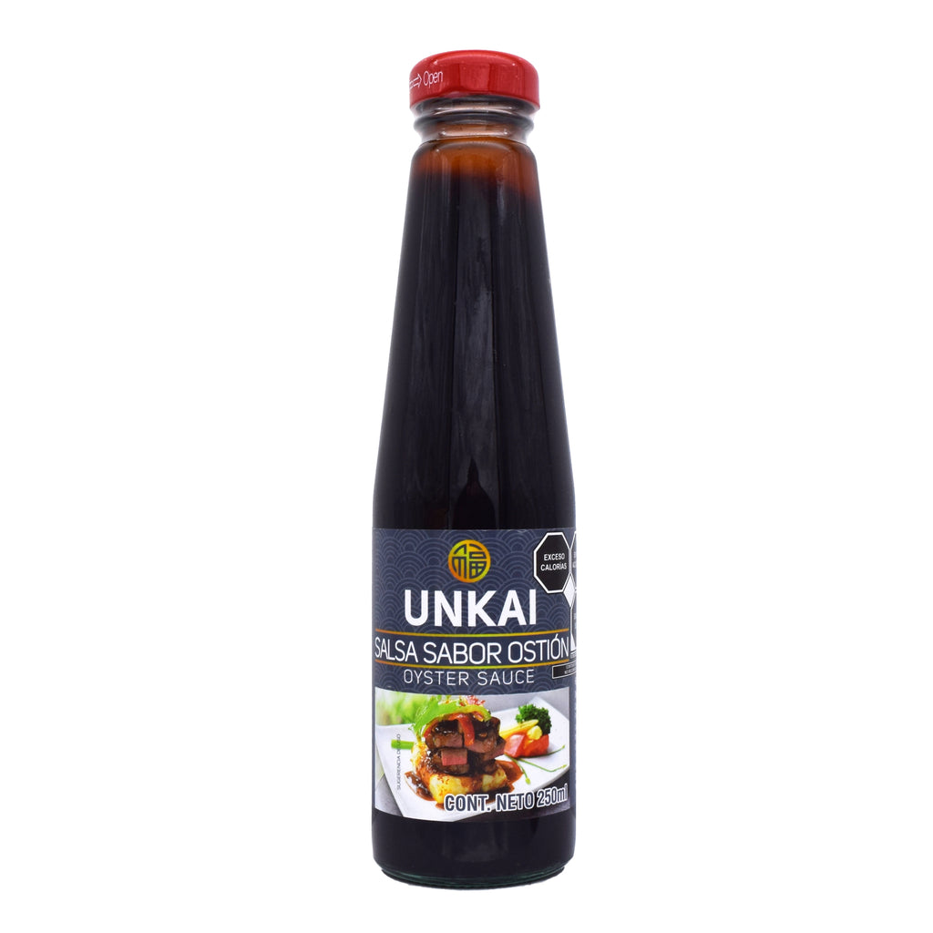 Agua, jugo de ostra, salsa de soya, fécula de maíz modificada, azúcares añadidos, sal yodada, glutamato monosódico, caramelo, sorbato de potasio, conservador, aspartame