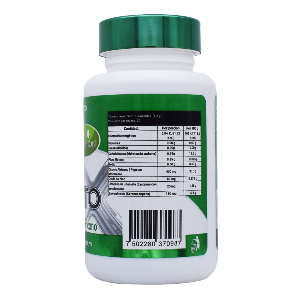 Ciruelo africano, celulosa, microcristalina, saw palmetto, licopeno de jitomate, óxido de zinc