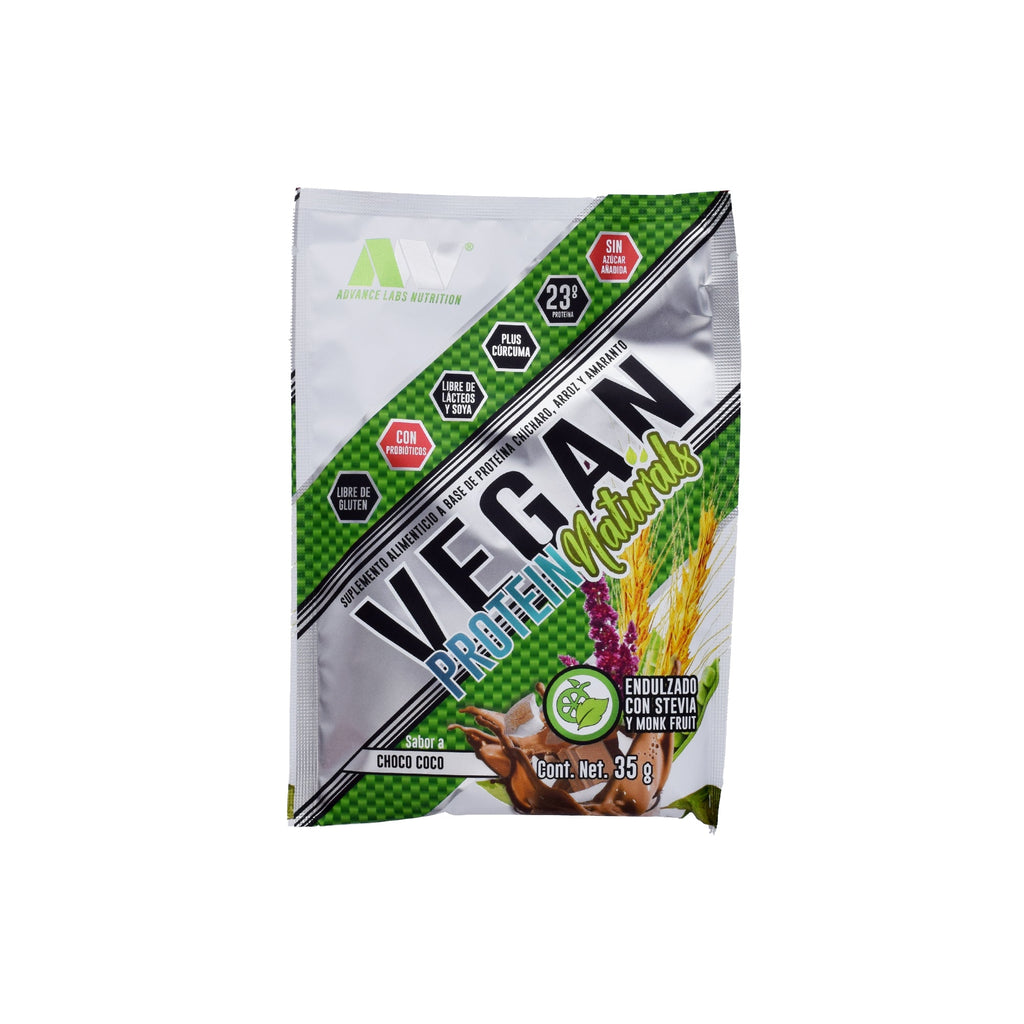 Proteína de chícharo, proteína de arroz, proteína de amaranto, sabor natural y artificial a chocolate coco, fruto del monje, estevia, cúrcuma, dióxido de silicio, arándano en polvo