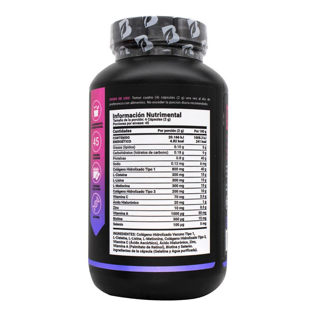 Colágeno hidrolizado tipo 1, colágeno hidrolizado tipo 3, L-cisteína, L-lisina, L-metionina, ácido hialurónico, zinc, biotina, selenio, vitamina C y vitamina A